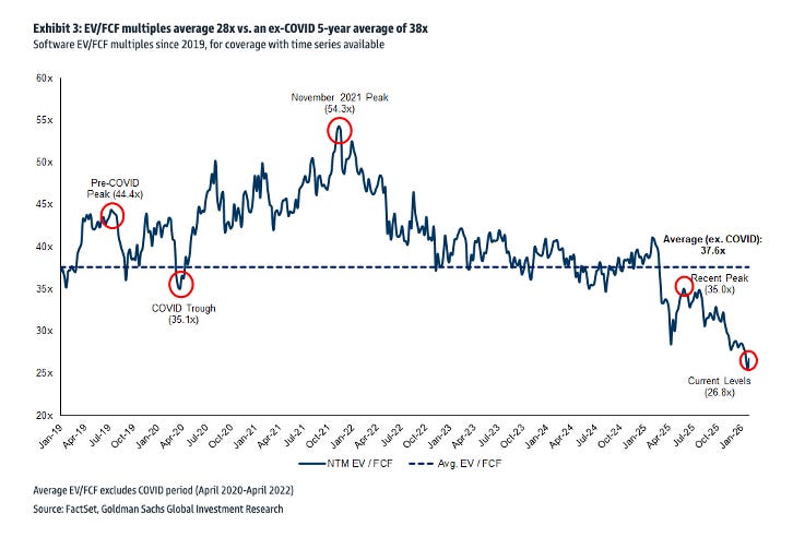 That insight made Smith a deca-billionaire. It also became gospel among investors, propelling software multiples to significant premiums over the broad market. According to Goldman Sachs, software stocks have traded at an average of 37.5x EV/FCF since 2018, largely because of their perception as “better than first-lien debt.”