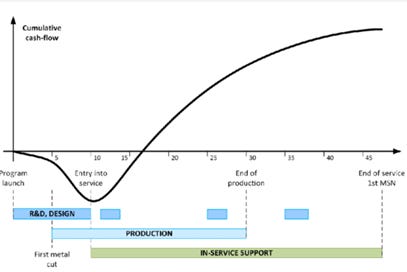 Rolls-Royce, General Electric, and Pratt & Whitney are the primary manufacturers of jet engines and aircraft component replacement parts. Collectively these OEMs follow a razor/razor-blade model whereby they spend billions on R&D to develop and build complex aerospace parts which lose money upon sale to their customers. The OEMs make money from in-service support (like replacement parts and service) once their programs have launched, slowly recouping their up-front investment. It’s not uncommon for a program to take a full 15 years to reach breakeven. Below is an illustration of what an OEM’s cash flow generally looks like over the life of a program.